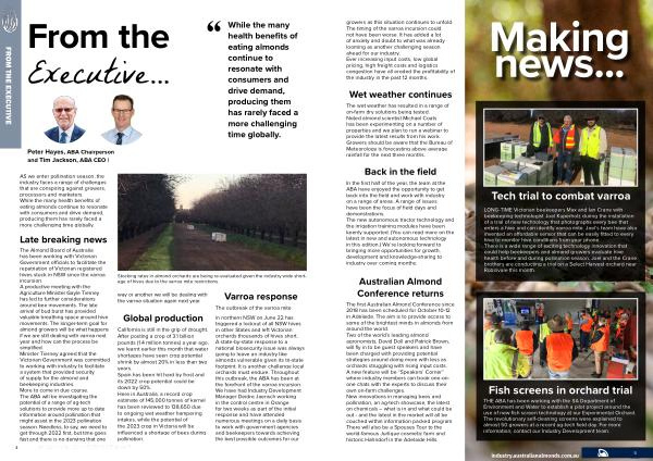 LONG-TIME Victorian beekeepers Max and Ian Crane with beekeeping technologist Joel Kuperholz during the installation of a trial of new technology that photographs every bee that enters a hive and can identify varroa mite . Joel ’ s team have also invented an affordable sensor that can be easily fitted to every hive to monitor hive conditions from your phone . There is a wide range of exciting technology innovation that could help beekeepers and almond growers evaluate hive health before and during pollination season . Joel and the Crane brothers are conducting a trial on a Select Harvest orchard near Robinvale this month .