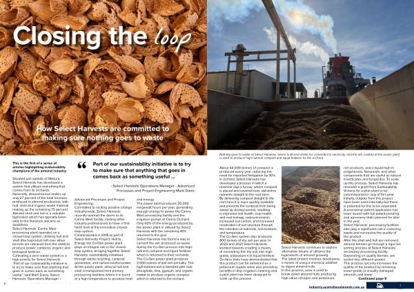 About 44,000 tonnes of compost is produced every year , reducing the need for imported fertigation by 30 %. In orchard , Select Harvests has developed a process in which a machine digs a furrow , where compost is placed and covered over , delivering nutrients straight to the root zone . By delivering compost straight to the root zone it is more quickly available and prevents the compost from being swept up during harvest , resulting in improved soil health , crop health , and root biology , reduced erosion , increased soil carbon , and increased moderation of soil structure through the retention of nutrients , soil moisture , and temperature . The Co-Gen system also produces 800 tonnes of dry ash per year . In 2020 and 2021 Select Harvests worked towards creating a means of converting this dry ash into highgrade , potassium-rich liquid fertiliser . On-farm trials have demonstrated that this product can be delivered as a potassium supply while also providing benefits in drip irrigation cleaning and a pilot plant has been designed to scale up this process .
