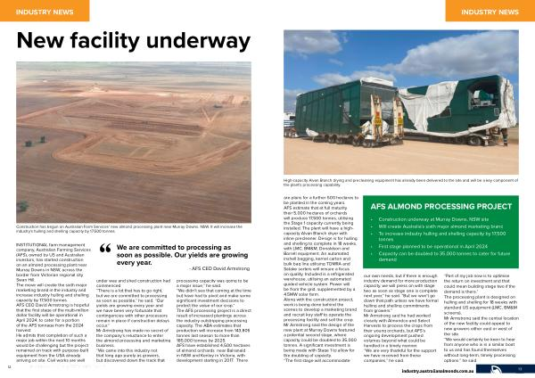 are plans for a further 500 hectares to be planted in the coming years . AFS estimate that at full maturity their 5,000 hectares of orchards will produce 17,500 tonnes , utilising the Stage 1 capacity currently being installed . The plant will have a highcapacity Alvan Blanch dryer with inline precleaner . Design is for hulling and shelling to complete in 18 weeks , with LMC , BM & M , Donaldson and Borrell equipment . An automated inshell bagging , kernel carton and bulk bag line utilising TOMRA and Satake sorters will ensure a focus on quality . Included is a refrigerated warehouse , utilising an automated guided vehicle system . Power will be from the grid , supplemented by a 4.5MW solar farm . Along with the construction project , work is being done behind the scenes to develop a marketing brand and recruit key staff to operate the processing facility and sell the crop . Mr Armstrong said the design of the new plant at Murray Downs featured a potential second stage , where capacity could be doubled to 35,000 tonnes . A significant investment is being made with Stage 1 to allow for the doubling of capacity . “ The first stage will accommodate