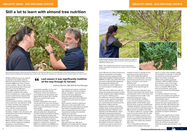AFTER a difficult season for almond production and quality , Anthony Wachtel from the Almond Board of Australia ( ABA ) says when it comes to tree nutrition , “ there is still a lot to learn about what we don ’ t know yet ’’. Anthony is Orchard Manager at the ABA ’ s Almond Centre of Excellence property near Loxton , which it manages for a wide range of research with industry departments , tertiary institutions and commercial organisations . The 60-hectare property , comprising loamy sand soils , was planted in 2017 to several varieties and rootstocks , including some new Australian lines , with the research looking at various issues including tree densities , irrigation , tree structure , soil amelioration and orchard machinery , as well as nutrition . High quality fertilisers are used in the orchard , including Haifa ’ s Multi-K potassium nitrate , as well as calcium nitrate , potassium sulphate , phosphorus , liquid fertilisers , UAN and micronutrients including