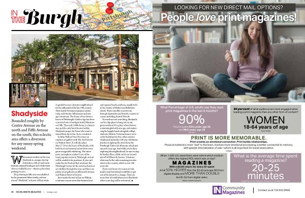 It quickly became a favorite neighborhood for the influential of the late 19th century . Their stately Victorian mansions coexist today with trendy coffeehouses and new age restaurants . The home of one former baron of Pittsburgh ’ s Golden Age has been converted into a boutique hotel , Mansions on Fifth . This early 1900s home is a luxury stay and the only hotel located within Shadyside proper for those who want to extend their day in the city to a weekend . In May , Walnut Street becomes an outdoor art gallery with The Art Festival on Walnut Street . It will take place May 27-28 in the heart of Shadyside , with both local and national artists from every genre imaginable exhibiting . The street party atmosphere makes it one of the most popular events in Pittsburgh , and art will be available for purchase . If you can ’ t make the Art Festival that weekend , the Pittsburgh Center for the Arts has featured art exhibits through the year , and there are plenty of art galleries on Ellsworth Avenue and Walnut Street to browse .