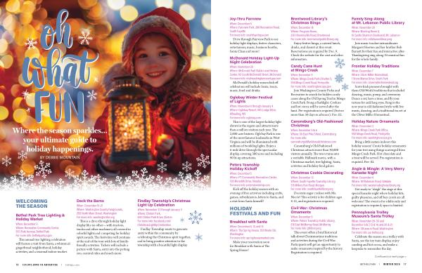 When: December 5 & 6 Where: 68 East Pike Street, Canonsburg For more info: canonsburgoldfashionedchristmas. com Canonsburg’ s Old-Fashioned Christmas attracts more than 30,000 visitors annually. The town turns into a veritable Hallmark movie, with a Christmas market, tree lighting, Santa, activities and holiday food galore.