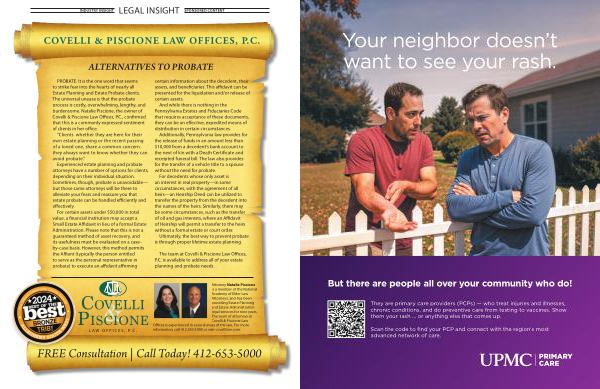 Attorney Natalie Piscione is a member of the National Academy of Elder Law Attorneys, and has been providing Estate Planning and Estate Administration legal services for nine years. The team of attorneys at Covelli & Piscione Law Offices is experienced in several areas of the law. For more information, call 412.653.5000 or visit covellilaw. com.