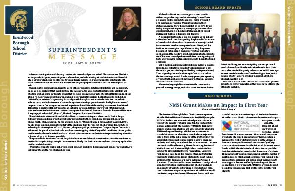 Our supportive community and parents, along with our experienced staff, administrators, and support staff, enable us to be confident that our students will be successful. We are consistently refining our curriculum and reflecting on sharpening our focus to ensure that we move beyond memorization to critical thinking and problem solving. From our youngest kindergarten students to our graduating seniors, the Brentwood Borough School District offers a variety of programming for social growth through our extracurricular activities that include athletics, clubs, and volunteer work. Course offerings are expanding again this year in the high interest area of computer science. Our youngest learners will experience the addition of the reading room where foundational skills critical to reading will be stressed. We are entering our second of three years for our NMSI grant which motivated more students than ever to strive to complete the Advanced Placement Exams in the areas of Literature & Language, Calculus AB / BC, Physics C, Physics I, Computer Science, and Statistics.