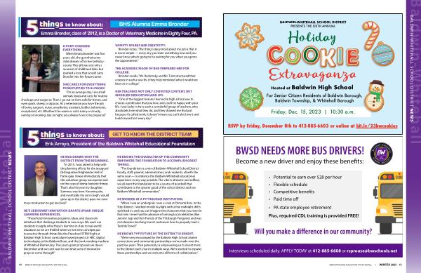 “ One of the biggest lessons I learned in high school was to choose a profession that you love , and you ’ ll be happy with your life . I was lucky to have such a wonderful group of teachers , who absolutely love what they do , and they showed me that just because it ’ s called work , it doesn ’ t mean you can ’ t also love it and look forward to it every day .” aldwin-Whitehall BALDWIN-WHITEHALL SCHOOL DISTRICT NEWS things
