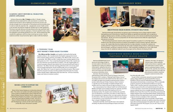 At Moore Elementary , Mrs . T . Ziegler and Mrs . D . Ziegler ' s classes celebrated Johnny Appleseed Day with some hands-on activities ! The students learned about Johnny Appleseed , the American pioneer who introduced apple trees to large parts of Pennsylvania and surrounding areas . In order to make the experience 4d – engaging the senses of sight , sound , scent and taste , the teachers taught the students how to make applesauce . This lesson was both delicious and educational as the class used both math and reading skills to make the applesauce . Everyone read the recipe , mixed the ingredients , and waited patiently for it to cook . All the burgeoning chefs sampled the applesauce with the recipe receiving rave reviews . Several students took their recipe home that night to make it with their families !! rentwood Borough SCHOOL DISTRICT NEWS