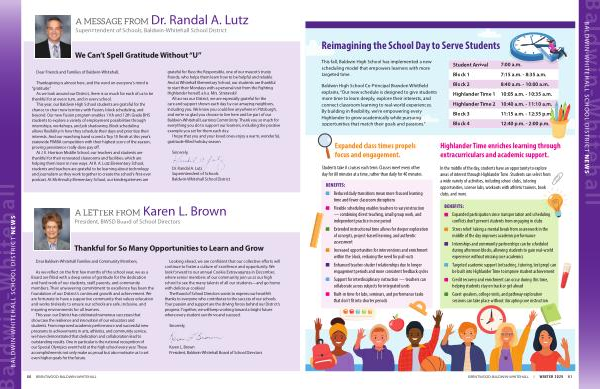 This year, our Baldwin High School students are grateful for the chance to chart new territory with Fusion, block scheduling, and beyond. Our new Fusion program enables 11th and 12th Grade BHS students to explore a variety of employment possibilities through internships, workshops, and job shadowing. Block scheduling allows flexibility in how they schedule their days and prioritize their interests. And our marching band scored a Top 10 finish at this year’ s statewide PIMBA competition with their highest score of the season, proving persistence really does pay off.