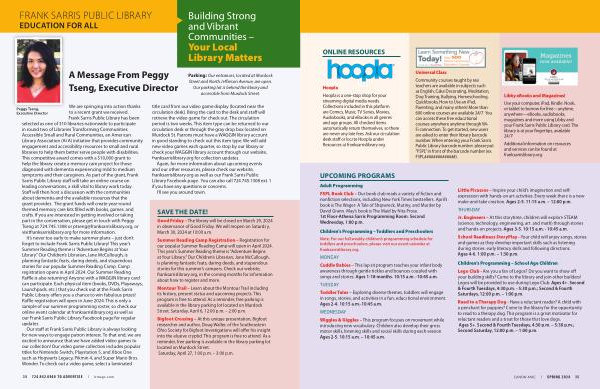 Use your computer , iPad , Kindle , Nook , or tablet to borrow for free — anytime , anywhere — eBooks , audiobooks , magazines and more using Libby and your Frank Sarris Public Library card . The library is at your fingertips , available 24 / 7 !