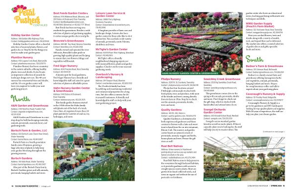 Address: 55 Prestley Road, Bridgeville Contact: cavanaughsnursery. com, 412.257.9677 Cavanaugh’ s Nursery & Supply is a go-to for gardeners and DIY landscapers looking for top-quality plants and supplies. With 20 years of experience, the staff can help you plan your dream garden.