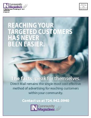 11 Mayview Road, Canonsburg, PA 15317 724.942.0940 icmags.com PRSRT STD US POSTAGE PAID PITTSBURGH, PA PERMIT NO. 887 REACHING YOUR TARGETED CUSTOMERS HAS NEVER BEEN EASIER. The facts speak for themselves. Direct Mail remains the single most cost effective method of advertising for reaching customers within your community. Contact us at 724.942.0940