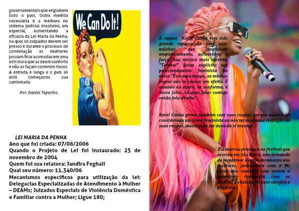 governamentais que englobem todo o país. Outra medida necessária é a melhora no sistema judicial brasileiro, em especial, aumentando a eficácia da Lei Maria da Penha, na qual os culpados devem ser presos e durante o processo de condenação as mulheres possam ficar acomodas em uma estrutura que as deem conforto e não as façam correrem riscos. A estrada é longa e o país só está começando sua caminhada.