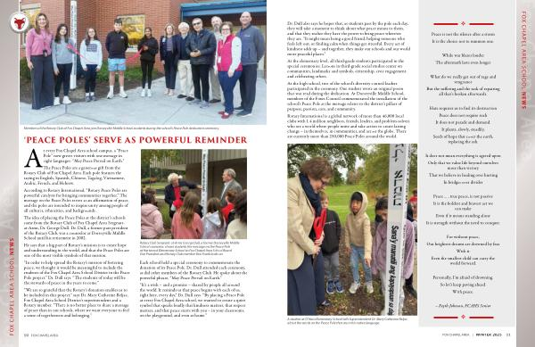 The idea of placing the Peace Poles at the district’ s schools came from the Rotary Club of Fox Chapel Area Sergeantat-Arms, Dr. George Dull. Dr. Dull, a former past president of the Rotary Club, was a counselor at Dorseyville Middle School until his retirement in 2002.