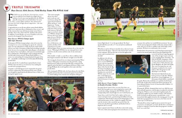 “ The team’ s strengths all year were their unity, work rate, and consistency, along with a great deal of technical ability and heart,” coach Ingram says.“ Facing Seneca Valley was a true indication of how strong both teams are. We had a target on our back coming in as WPIAL champions last year, but it was a good game of soccer. We knew we had to bring our‘ A’ game, and we did.”