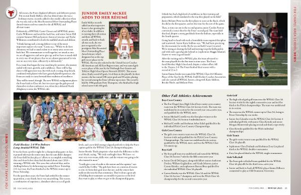 All season, the Foxes displayed offensive and defensive power. Pitt recruit Emily McKee, who has shined since she was a freshman starter, recently added to her medal collection when she was selected as the Moe Rosensteel Most Outstanding Player Award winner and was named to the all-WPIAL and all-state teams.