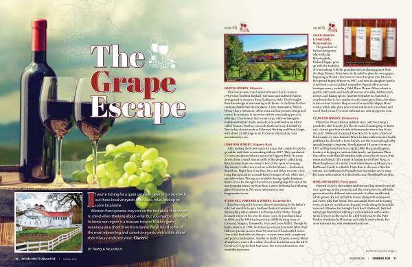 NARCISI WINERY , Gibsonia This family-owned and operated winery has its roots in 1911 when brothers Raphael , Giovanni and Gabriele Narcisi immigrated to America from Guilianova , Italy . They brought their knowledge of winemaking with them — a tradition that has continued with their descendants . A true destination , Narcisi Winery has a restaurant , offers tours and has private tastings and events . It continues to innovate with its winemaking process , offering a Chardonnay that is very crisp , while retaining the traditional buttery finish , and a dry red and blush wine blend called Granato that has a smooth finish and easy drinkability . Narcisi has classics such as Cabernet , Riesling and Pinot Grigio , with about 25 offerings in all . For more information , visit narcisiwinery . com .
