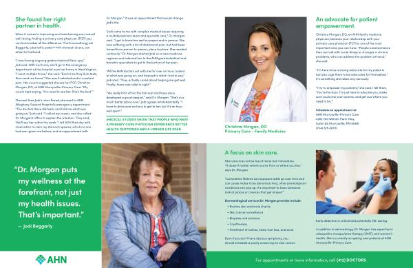 “ I was having ongoing gastrointestinal flare-ups ,” Jodi said . With each one , she ’ d go to the emergency department at the hospital near her home in West Virginia . “ I went multiple times ,” she said . “ Each time they ’ d do tests , then send me home .” She was frustrated and in constant pain . Her cousin suggested she see her PCP , Christina Morgan , DO , at AHN Murrysville-Primary Care . “ My cousin kept saying , ‘ You need to see her . She ’ s the best .’”