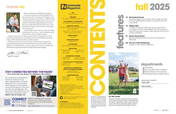 Welcome to the fall issue of IN Hampton magazine. As summer heat gives way to fall, the beautiful scenery and cool autumn breezes are the perfect backdrop to some of the best community events of the year— fall festivals and community days! From pumpkin patches, corn mazes and hayrides to Oktoberfests, apple picking and much more, the season is packed with family fun. Check out our“ Fall Festival Fever” listings for dozens of festive events right in your own backyard.