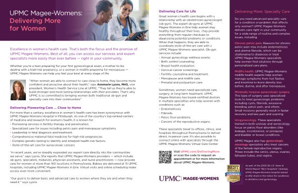 Excellence in women’ s health care. That’ s both the focus and the promise of UPMC Magee-Womens. Best of all, you can access our services and expert specialists more easily than ever before— right in your community.