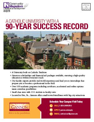 PRSRT STD US POSTAGE PAID PITTSBURGH, PA PERMIT NO. 887 11 Mayview Road, Canonsburg, PA 15317 724.942.0940 icmags.com A CATHOLIC UNIVERSITY WITH A 90-YEAR SUCCESS RECORD • A University built on Catholic Tradition • Generous scholarships and financial aid packages available, ensuring a high-quality education is within everyone’s reach • Our faculty experts provide real-world experience and lead you to internships that prepare you to become a professional in the field • Over 100 academic programs including certificate, accelerated and online options mean countless possibilities • Small class sizes with 13:1 student-to-faculty ratio • Located in Erie, Pa., Gannon offers small-town friendliness with big-city attractions Schedule Your Campus Visit Today CALL | 1-800-GANNON-U APPLY | gannon.edu/apply EMAIL | admissions@gannon.edu