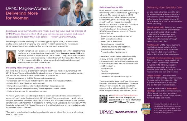 Do you need advanced specialty care for a condition or problem that affects only women? UPMC Magee-Womens delivers care right in your community for a wide range of routine and complex issues, including:
