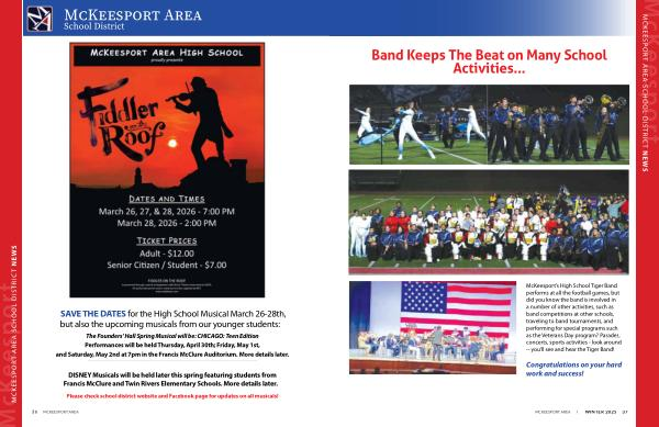 McKeesport’ s High School Tiger Band performs at all the football games, but did you know the band is involved in a number of other activities, such as band competitions at other schools, traveling to band tournaments, and performing for special programs such as the Veterans Day program? Parades, concerts, sports activities- look around-- you ' ll see and hear the Tiger Band!