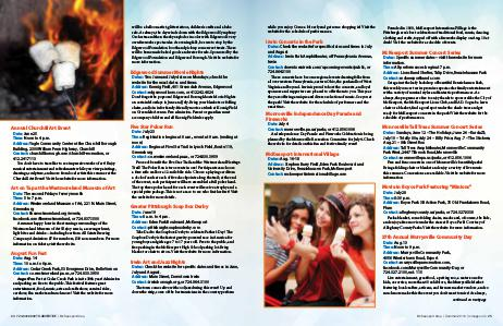 July Date 23: July, 1 to 288 p. m. Address Time: 8:30: Penn p. m. Hills Library, 1037 Stotler Road, Penn Hills Contact Address: Janice Boyce Pfeifer Park 3B at Action 412.793.8302 Park, 75 Old Frankstown Road, Plum You don’ t have to travel far this summer to view impressive art! The Penn Contact Hills: alleghenycounty Arts Council is hosting. us / parks its annual, or 724.327.0338