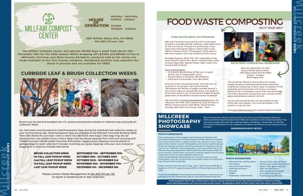 Millcreek Township in partnership with Conservation Compost is working towards creating a sustainable future for the community . Through this partnership , a food waste drop-off program began in March 2022 at the Millfair Compost Center . This program will be open to Millcreek residents and to all residents of Erie County .