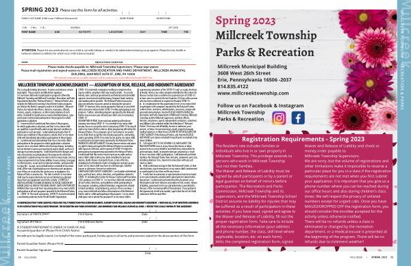 The Resident rate includes families or individuals who live in or own property in Millcreek Township . This privilege extends to persons who work in Millcreek Township but not their families . The Waiver and Release of Liability must be signed by adult participants or by a parent or legal guardian on behalf of minors before participation . The Recreation and Parks Commission , Millcreek Township and its supervisors , and the Millcreek Township School District assume no liability for injuries that may be suffered as a result of participation in these activities . If you have read , signed and agree to the Waiver and Release of Liability , fill out the proper registration form . Take care to include all the necessary information ( your address and phone number , the class , skill level where applicable , location , etc . on each form ). MAIL the completed registration form , signed