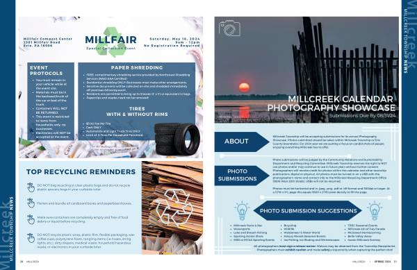 Photo submissions will be judged by the Community Relations and Sustainability Department and Recycling Committee . Millcreek Township reserves the right to NOT use photos and / or may continue to use in future years without further consent . Photographers will receive credit for photos within the calendar and other township publications , digital or physical . All photos must be turned in on a USB with the photographer ' s name and contact info to the Millcreek Recycling Department Office ( 3608 West 26th Street ). USBs will not be returned .