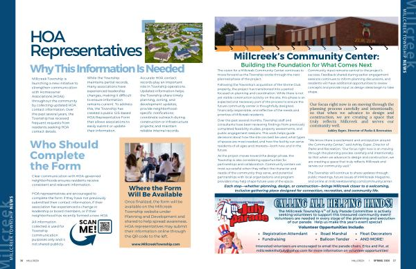 The Township will continue to share updates through public meetings, future issues of InMillcreek Magazine, and online at millcreektownship. com / communitycenter.