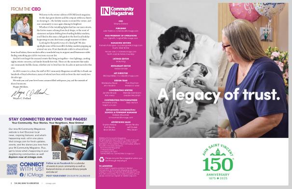 © 2025 by IN Community Magazines. All rights reserved. Reproduction or reuse of any part of this publication is prohibited without the written permission of the publisher. Direct all inquiries, letters to the editor and press releases to: IN Community Magazines 11 Mayview Road Canonsburg, PA 15317 724.942.0940; Fax: 724.942.0968 / icmags. com