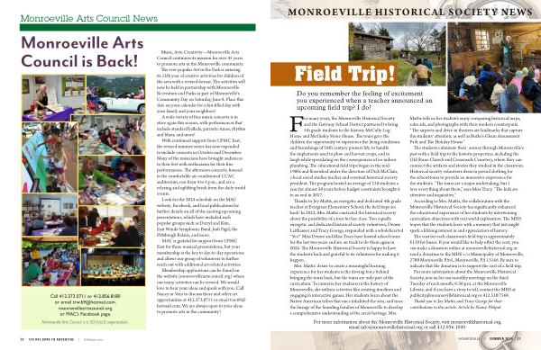 Thanks to Joy Mattis , an energetic and dedicated 4th grade teacher at Evergreen Elementary School , the field trips are back ! In 2022 , Mrs . Mattis contacted the historical society about the possibility of a tour for her class . Two equally energetic and dedicated historical society volunteers , Denise Leithauser and Tracy George , responded with a wholehearted “ Yes !” Miss Denise and Miss Tracy have hosted school tours for the last two years and are on track to do them again in 2024 . The Monroeville Historical Society is happy to have the students back and grateful to its volunteers for making it happen .