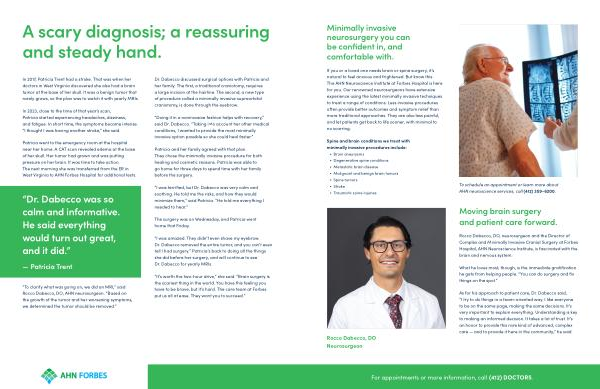If you or a loved one needs brain or spine surgery , it ’ s natural to feel anxious and frightened . But know this : The AHN Neuroscience Institute at Forbes Hospital is here for you . Our renowned neurosurgeons have extensive experience using the latest minimally invasive techniques to treat a range of conditions . Less invasive procedures often provide better outcomes and symptom relief than more traditional approaches . They are also less painful , and let patients get back to life sooner , with minimal to no scarring .