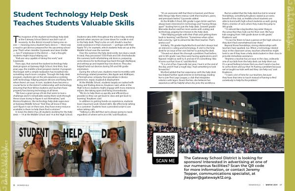 Years ago , that started the student technology help desk program at Gateway High School . And then , four years ago , the middle school program started . A program that began with a simple realization has morphed into something much more complex . Through the help desk program , students get on the job experience working with technology , helping prepare devices and fixing them when there ’ s an issue . In turn , students have become a crucial factor in the district ’ s relationship with technology , ensuring that their fellow students and teachers have properly functioning technology at all times .