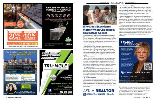 Experienced real estate agents are intimately familiar with Pittsburgh ’ s diverse neighborhoods , each having a unique charm and character . They understand the local market trends , property values , and the factors that influence them . This knowledge enables them to provide you with insights on which neighborhoods match your preferences and budget , ensuring that you make an informed decision . 2 . Pricing Expertise Determining the right price for a property can be a challenging task . Overpricing can deter potential buyers , while underpricing can result in missed opportunities . A skilled agent can conduct a comprehensive market analysis , considering factors such as recent sales , neighborhood desirability , and property condition , to help you set the optimal price for your listing or make an informed offer . 3 . Negotiation Skills Negotiating real estate deals requires finesse , strategy , and knowledge of local customs and laws . Experienced agents excel in this arena , working tirelessly to secure the best possible outcome for their clients . They can manage complex negotiations , contingencies , and counteroffers , ensuring that your interests are protected throughout the process . 4 . Access to Resources Seasoned real estate agents have a vast network of contacts , from mortgage brokers and home inspectors to contractors and attorneys . This network can prove invaluable when you need referrals to trusted professionals who can facilitate a smooth transaction . These connections can save you time and money while ensuring a hasslefree experience .