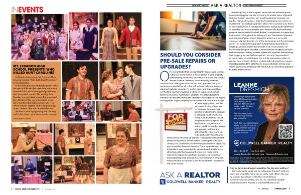 One crucial factor that can significantly impact your success in the real estate market is the condition of your property . Before listing your home , talk with a real estate professional like me , Leanne Dresmich , about investing time and resources into making necessary repairs and upgrades . Doing so can bring a myriad of benefits that will not only help your property stand out but also maximize its market value , and it is easier than ever ! Selling your home just got a whole lot easier with Coldwell Banker ’ s innovative RealVitalize ® program . This groundbreaking initiative not only streamlines the process of making necessary repairs and upgrades to your property but also offers the unique advantage of deferring payment until the successful closing of your sale . Let ’ s explore the numerous benefits of utilizing this program to enhance your home before listing it on the market . One of the primary advantages of the RealVitalize ® program is the ability to address needed repairs and upgrades without any upfront costs . I have found this to be particularly beneficial for homeowners who may be hesitant to invest in improvements before selling . With Coldwell Banker covering the costs until closing , you can elevate your home ’ s appeal without impacting your immediate financial situation . The program enables you to transform your property into a market-ready masterpiece , attracting potential buyers with a move-in-ready home . From minor repairs to significant upgrades , our network of trusted professionals ensures that your home is not only wellmaintained but also stands out in the South Hills competitive real estate market .