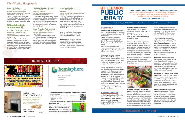 REGISTRATION IS REQUIRED FOR MANY OF THESE PROGRAMS . Go to the library ’ s events page at mtlebanonlibrary . org to register . Stay up-to-date … Friend the library on Facebook and visit mtlebanonlibrary . org to sign up for e-blasts . Questions ? Call 412.531.1912 .