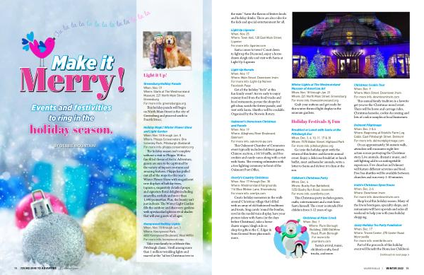 Get all the holiday “ feels ” at this fun family event ! Arrive early to enjoy yummy food from the food trucks and local restaurants , peruse the shops for gift ideas , watch the festive parade , and visit with Santa . Shuttles will be available . Organized by the Norwin Rotary .