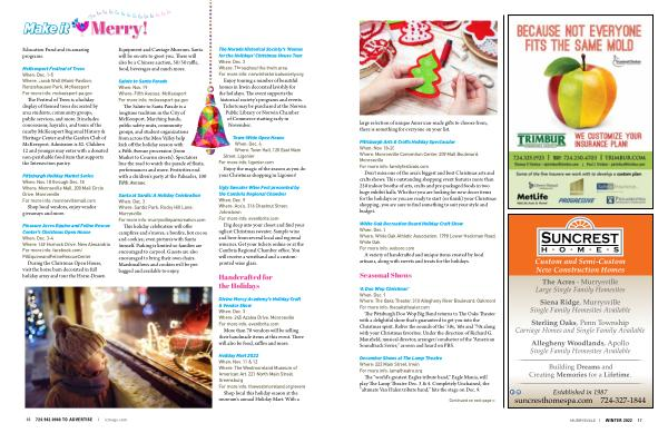 Pittsburgh Arts & Crafts Holiday Spectacular When : Nov . 18-20 Where : Monroeville Convention Center , 209 Mall Boulevard , Monroeville For more info : familyfestivals . com