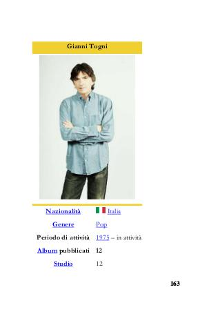Gianni Togni Italia Nazionalità Genere Pop Periodo di attività 1975 – in attività Album pubblicati 12 Studio 12 163