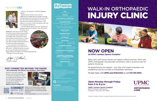 TO ADVERTISE As the largest magazine publisher in Western Pennsylvania, IN Community Magazines are direct mailed to 2 million households and businesses in more than 250 communities. If you’ d like to partner with us, please contact Leo Vighetti at ads @ icmags. com.