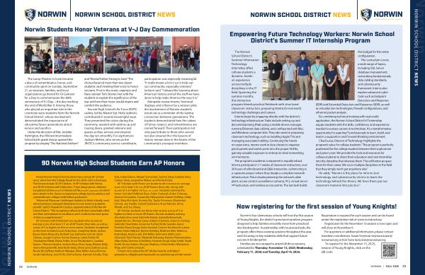 AP Scholar students are those who receive scores of 3 or higher on three or more AP Exams. Norwin students earning this distinction were Gabrielle Astrab, Gabriella Beresnyak, Joseph Brown, Thomas Casey, Adyson Clemens, Gannon Conboy, Gabrielle Danchisko, Giovanna Fuchel, Molly Geissler, Aaron Goettler, Keara Gregg, Greta Guenzel, Connor Gurekovich, Lanna Haines, Kayla Halpern, Korbin Holliday, Madison Kifer, Rebecca Kostrobala, Kayla Lovell, Elin Miller, Gemma Moffatt, Liam Odonnell, Tyler Patrick, Elizabeth Petteway, Kalaina Phetsomphou, Jillian Ryba, Dominic Schultheis, Harneet Singh, Katie Smith, Noah Smith, Teresa Solano, Morgan Stephan, Chloe Verdin, Mackenzie Wray, and Caitlin Zowacki.