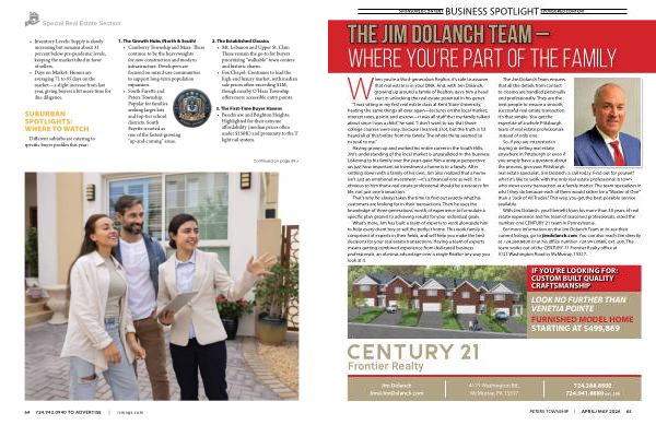 For more information on the Jim Dolanch Team or to see their current listings, go to jimdolanch. com. You can also reach Jim directly at 724.288.8800 or at his office number, 724.941.8680, ext. 208. The team works out of the CENTURY 21 Frontier Realty office at 4121 Washington Road in McMurray, 15317.