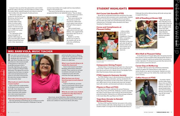 December marked the first Coffee House Show in the new PTHS Cafeteria . In addition to delicious desserts , the annual student talent show featured singing , dancing , musicians and more for the crowds each night . eters Township