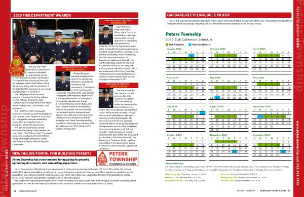 Below is the 2026 Bulk Collection Schedule. It once again will be the first full pickup week of the year. Visit peterstownship. com for complete details on garbage, recycling, and electronics / household hazardous waste pickup services.