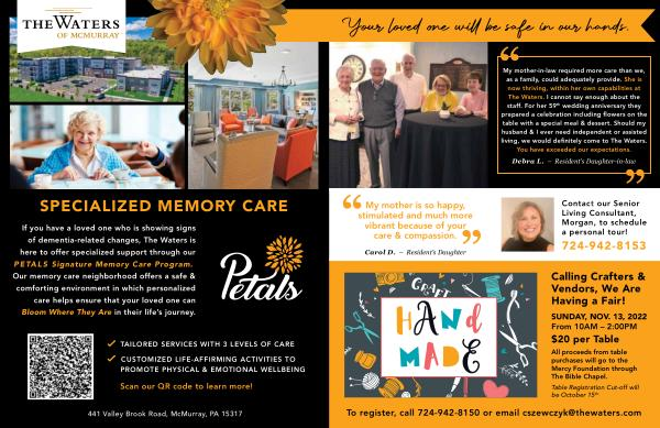 If you have a loved one who is showing signs of dementia-related changes , The Waters is here to offer specialized support through our PETALS Signature Memory Care Program .. Our memory care neighborhood offers a safe & comforting environment in which personalized care helps ensure that your loved one can Bloom Where They Are in their life ’ s journey .