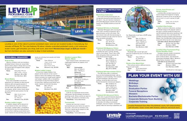 LevelUp is one of the nation’ s premier pickleball clubs— and we are located locally in Canonsburg, five minutes off Route 79. The club features 16 indoor climate-controlled pickleball courts, a full restaurant, locker rooms, golf simulator, pro shop, ball room, and more! Memberships begin at $ 20 per month— but non-members are also welcome to play in most activities.