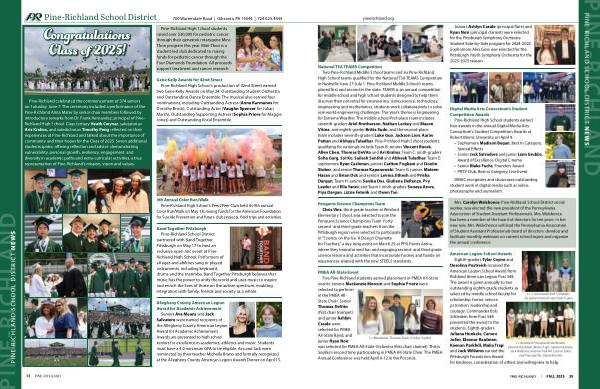 Pine-Richland celebrated the commencement of 374 seniors on Saturday, June 7. The ceremony included a performance of the Pine-Richland Alma Mater by senior choir members followed by introductory remarks from Dr. Frank Hernandez, principal of Pine- Richland High School. Class tertiary Heath Cwynar, salutatorian Aris Kralios, and valedictorian Timothy Peng reflected on their experiences at Pine-Richland and talked about the importance of community and their hopes for the Class of 2025. Seven additional students spoke, offering reflection and advice, demonstrating vulnerability, personal growth, resiliency, engagement, and diversity in academic paths and extra-curricular activities, a true representation of Pine-Richland’ s mission, vision and values.