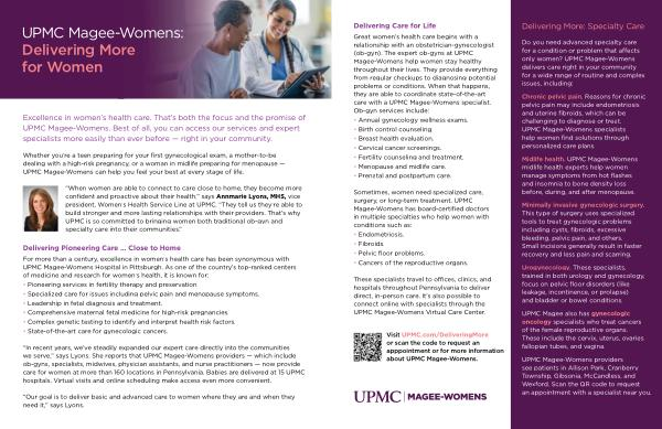 Excellence in women’ s health care. That’ s both the focus and the promise of UPMC Magee-Womens. Best of all, you can access our services and expert specialists more easily than ever before— right in your community.