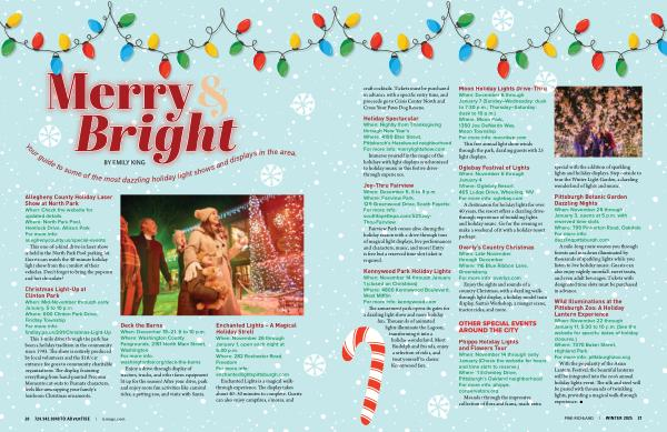 Enchanted Lights – A Magical Holiday Stroll When: November 26 through January 1, open each night at 5:30 p. m. Where: 282 Rochester Road, Freedom For more info: enchantedlightspittsburgh. com
